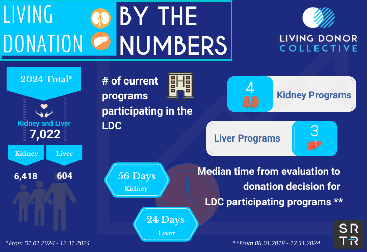Whether an organ is given to help save the life of a family member, a friend, or someone never met, the living donor experience is fraught with information gaps. As a program under the Scientific Registry of Transplant Recipients (SRTR), The Living Donor Collective’s (LDC) mission is to collect and analyze information provided through the registration of donor candidates, in an effort to expand our knowledge base of what happens to living donors after living organ donation. At LDC, we are data driven to improve outcomes for all potential living donors.
